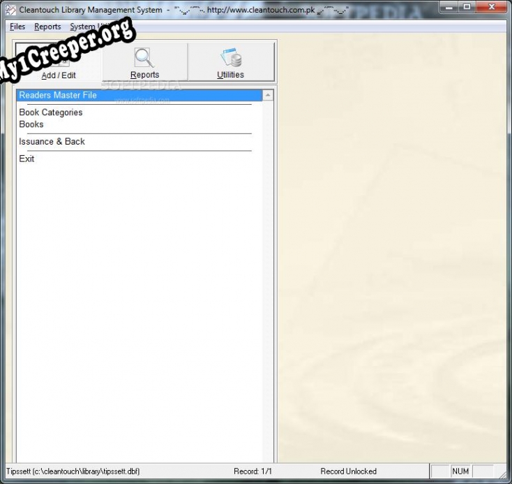 ![]() Добро пожаловать на My1Creeper.org! Представляем вам ключ для программы Cleantouch Library Management System! Кейген позволит вам беслпатно насладиться программой. Более подробная информация, а также ссылка на скачивание, ниже. Описание программы: A software to help libraries with their daily activities. Cleantouch Library Management System was developed to provide a complete hands on library management approach. Платформа: Windows All Количество скачиваний: 9362 Версия программы: Cleantouch Library Management System 1.0 и другие версии. Три бесплатных ключа: